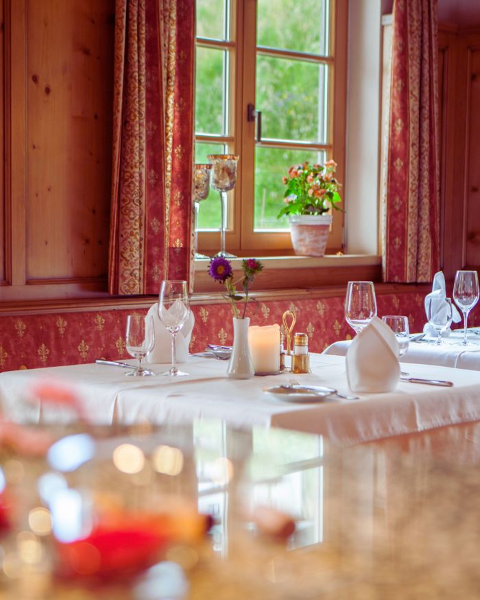 Breakfast is included in all rooms at both the Hotel and the Pension — a generous regional buffet served until 10:30, with homemade jams, Tyrolean cheeses, fresh bread and hot options. In winter, the Hotel restaurant is open in the evenings for à-la-carte dining with a menu built around Austrian classics and seasonal produce. Pension guests get priority table reservations at the main restaurant. In summer, the Bistro opens with a sunny terrace. Every Tuesday year-round is Fondue Night — very popular, book early. If you want to eat out, St. Anton has excellent restaurants within easy walking distance and we are happy to recommend based on what you are looking for.