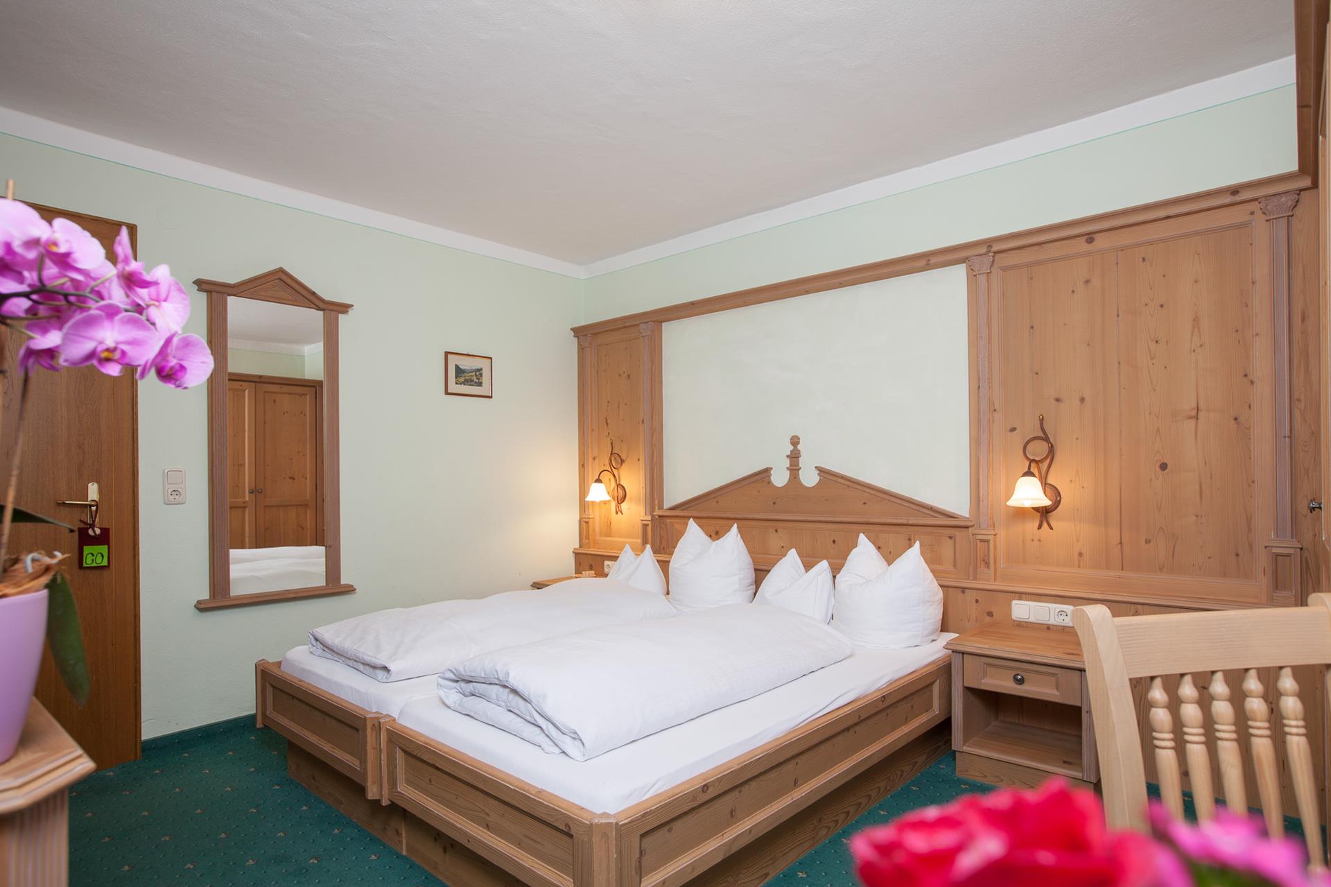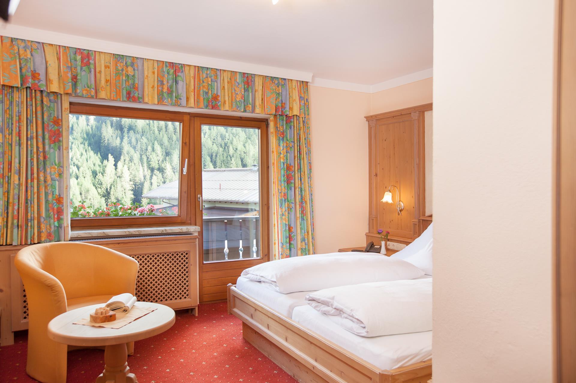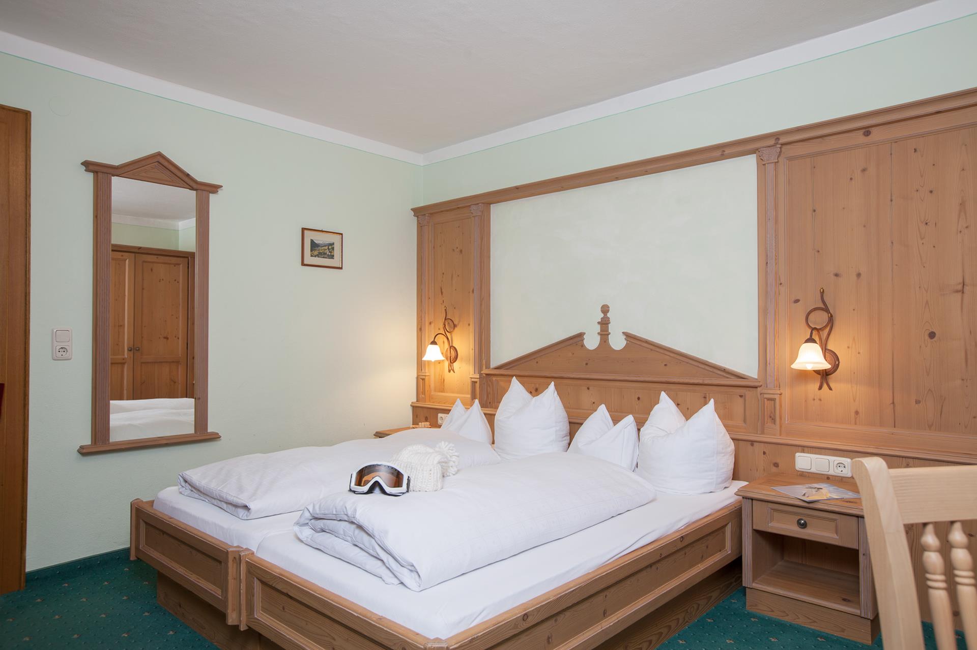 Double room with Tyrolean ambience approx. 22 m² on the 1st floor (also possible for single use), partly balcony to breathe deeply, furnishing in wood.